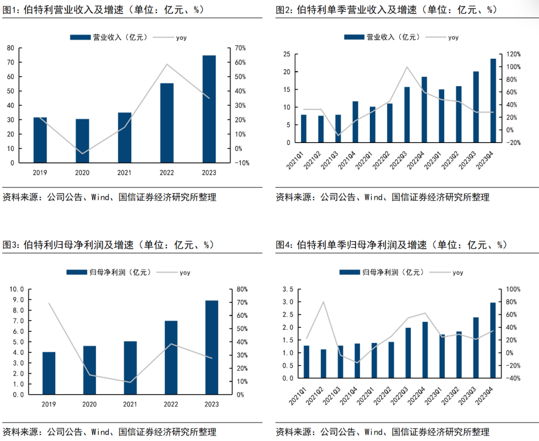 公司2023年营收同比增长35%,智能电控产品销量同比增长49%。23年实现营收74.74亿元(业绩预告74.5-78.6亿元),同比+35%;实现归母净利润8.91亿元(业绩预告8.8-9.6亿元),同比+28%;单季度看,23Q4收入23.68亿元,同比+28%,环比+18%;实现归母净利润2.97亿元,同比+34%,环比+24%。分产品看,23年公司智能电控产品销量372万套,同比增长48.93%;盘式制动器销量 285万套,同比增长26.55%;轻量化制动零部件销量1019万件,同比增长31.32%,机械转向产品销量 233万套。