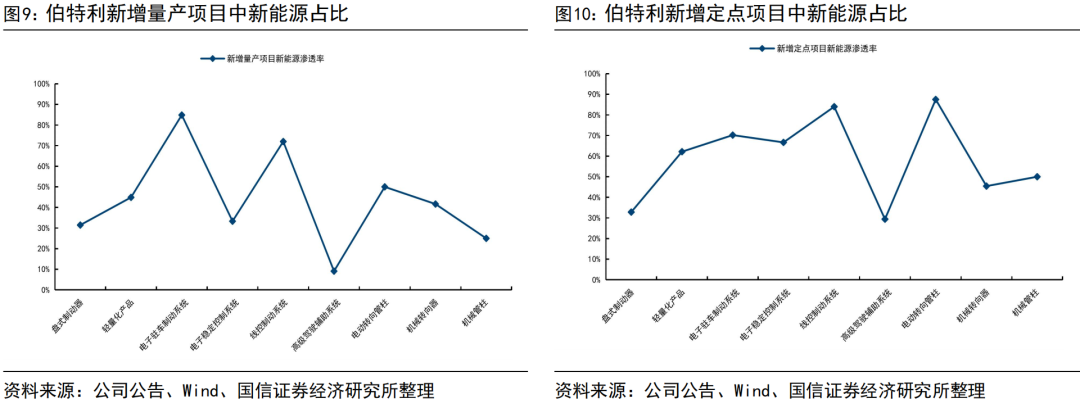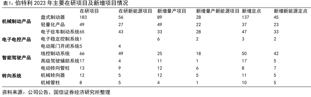 公司是国产制动系统龙头企业,定点持续增加。公司在技术工艺、产能规模、客户资源方面具备一定优势。随着汽车行业向轻量化、智能化的方向发展、国产化进程加速,公司在手项目充足。公司2023 年度新增量产项目241项,同比增长45%;新增定点项目319项,同比下降14%;其中公司EPB在研项目65项(新能源43项),新增量产33项(新能源28项),新增定点47项(新能源33项);线控制动在研项目66项(新能源49项),新增量产25项(新能源18项),新增定点50项(新能源42项)。