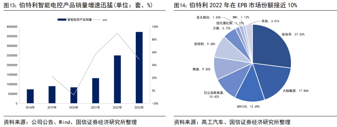 机械制动贡献业绩基底,平台化趋势有望进一步提升公司业绩。公司机械制动产品主要包括盘式制动器、液压卡钳、轻量化零部件。公司在机械制动市场扎根多年,具备自主正向开发能力,可根据客户整车需求设计出相应配套产品,具有协同客户同步开发、同步设计的能力;具有较强的系统开发能力,能为客户提供系统的解决方案;同时,公司在稳定现有优势前提下,全面开发更低拖滞力矩卡钳总成及低跳动制动器产品,推动固定式卡钳的开发和推广,降低整车能耗,增强为中高端乘用车的配套能力。2023年公司盘式制动器销量为285万套,同比增长27%,占据国内市场份额的11%。近几年整车厂存在明显的平台化产品趋势,公司竞争力强,产品市场份额有望持续增长。