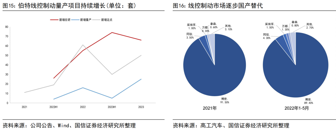 伯特利是国内少数拥有自主知识产权,能够批量生产电子驻车制动系统、制动防抱死系统及电子稳定控制系统、线控制动系统等智能电控产品的企业,赋能自主品牌实现双赢增长,随自主品牌走向海外,公司在美国、墨西哥等国家也同步布局海外研发和生产基地。在墨西哥新增年产50万套电子驻车制动系统卡钳生产线;墨西哥年产400万件轻量化零部件产线于2023年9月投产;2023年6月1.65亿美元投建墨西哥年产550万件铸铝转向节、170万件控制臂/副车架、100万件电子驻车制动钳、100万件前制动钳等产能,后续公司将考虑在海外其他地区推进布局。