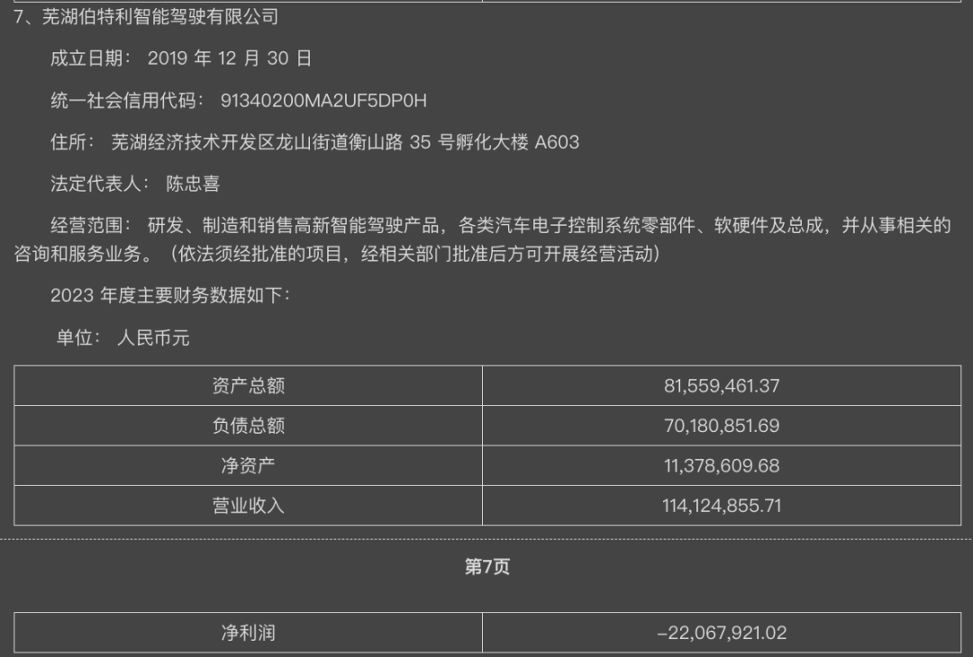 财务数据显示,2023年,伯特利智能驾驶业务首次实现零的突破,营收1.14亿元,净利润亏损2206.79万元。