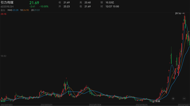 尽管如此,引力传媒的股价还是在12月19日盘中触及上市以来最高点29.16元/股(按前复权计算),这一价格较该公司10月31日9.58元/股的收盘价上涨204.38%。12月20日,上交所向引力传媒下发《监管工作函》,就公司股价异常波动相关信息披露明确监管要求。此后几个交易日,该股震荡回落。12月27日,短剧概念股下挫,引力传媒盘中跌停,截至当日收盘,公司股价为21.69元/股,较此前高点已下挫25%,市值为58亿元。