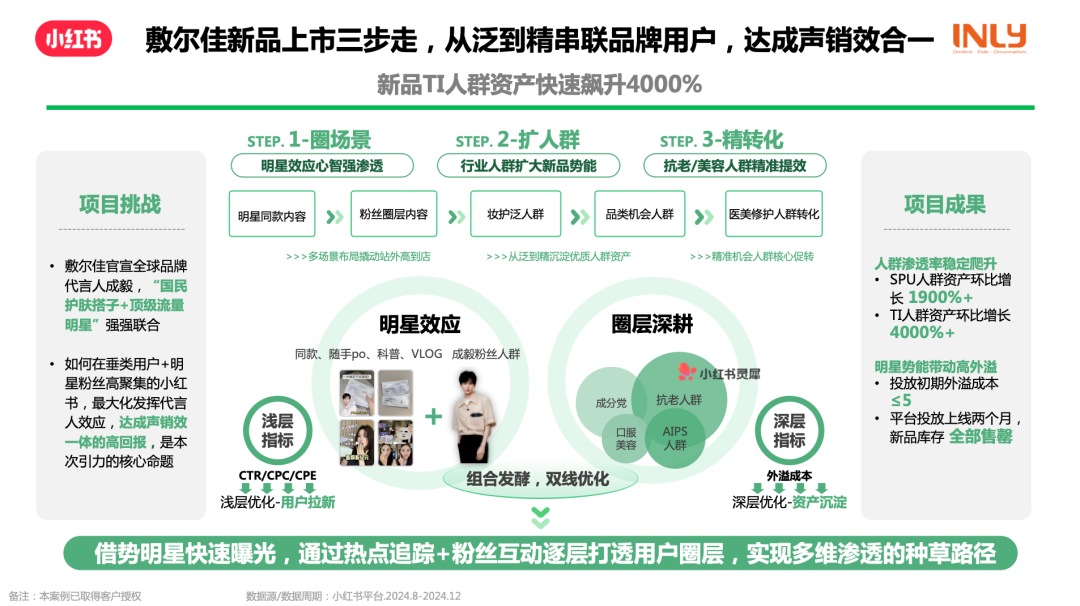 如何在垂类用户+明星粉丝高聚集的小红书,最大化发挥代言人效应,是本次传播的核心命题。引力传媒采用“圈场景—扩人群—精转化”新品上市三步走策略,通过代言人成毅的明星效应深度渗透用户心智,利用同款内容和成毅人群撬动站外到店,带动品牌站外高外溢;通过热点追踪+粉丝互动逐层打透用户圈层,实现多维渗透的种草路径,T1人群提升4000%,新品势能全面释放。