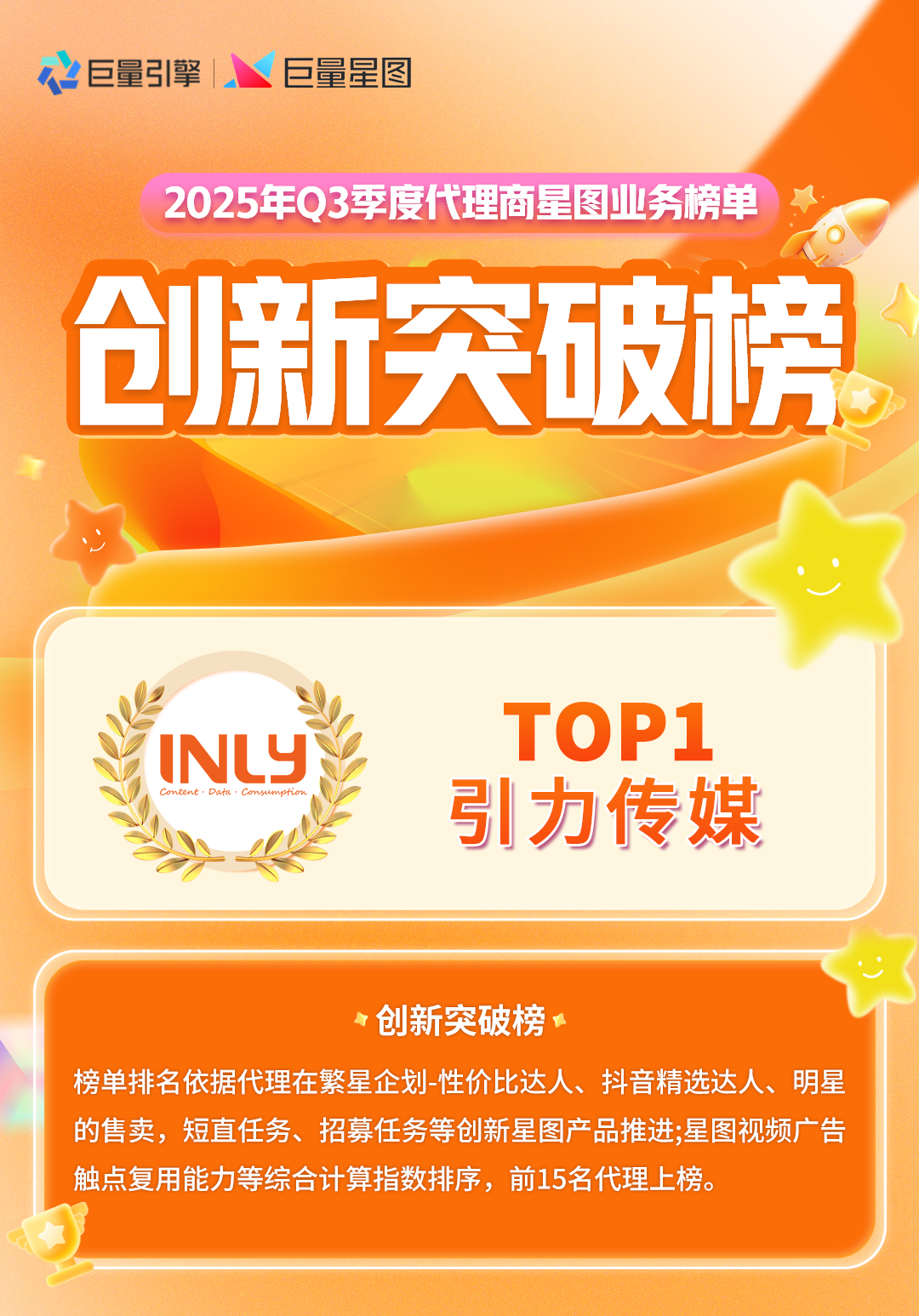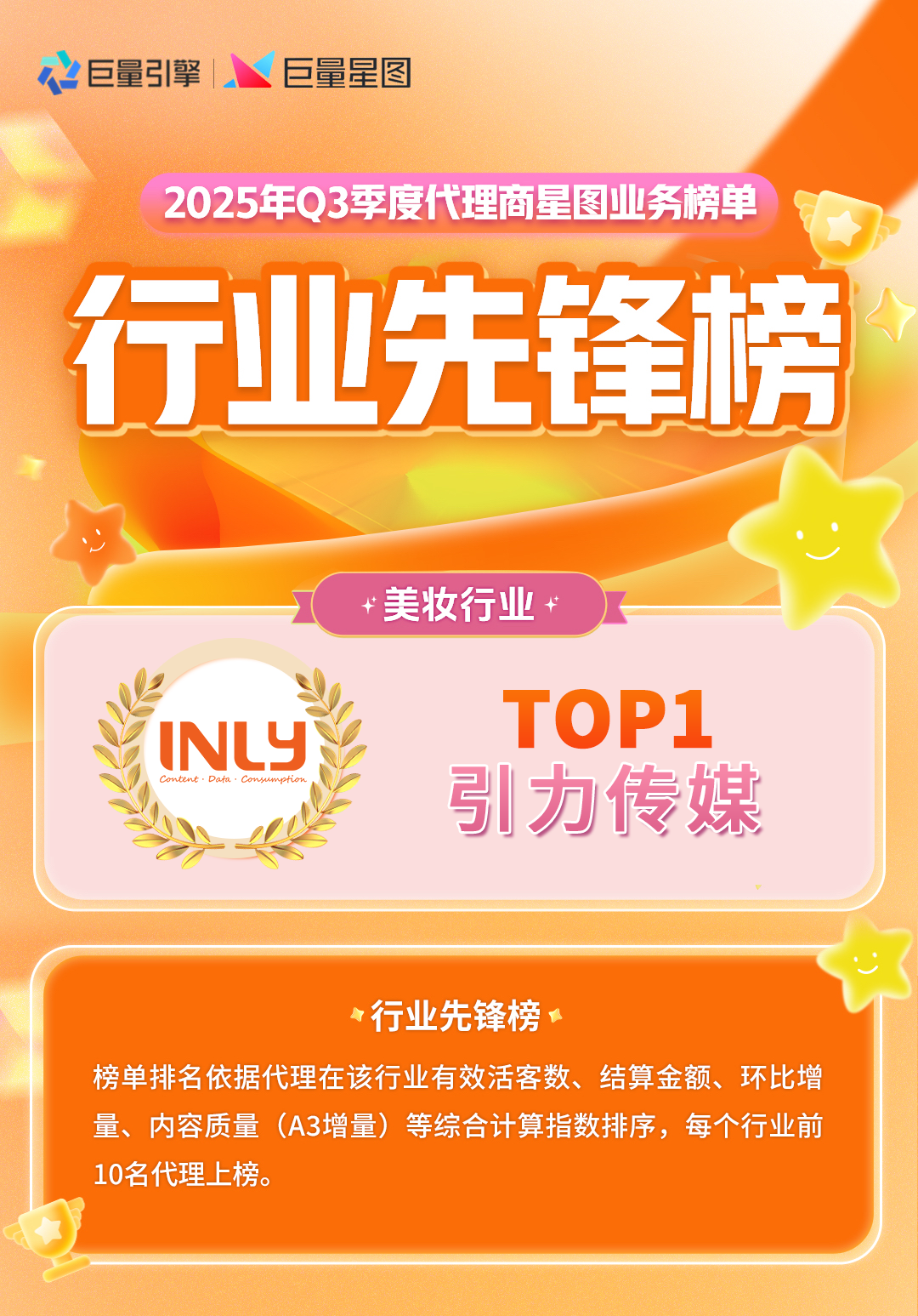 2025年Q3巨量引擎星图季度榜单正式揭晓!引力传媒凭借在全链路整合服务领域的深厚积淀与高效精准的客户开拓能力,在激烈的行业竞争中脱颖而出,一举斩获两大重磅荣誉——荣登美妆行业先锋榜单TOP1、创新突破榜单TOP1,双榜登顶成绩显赫。