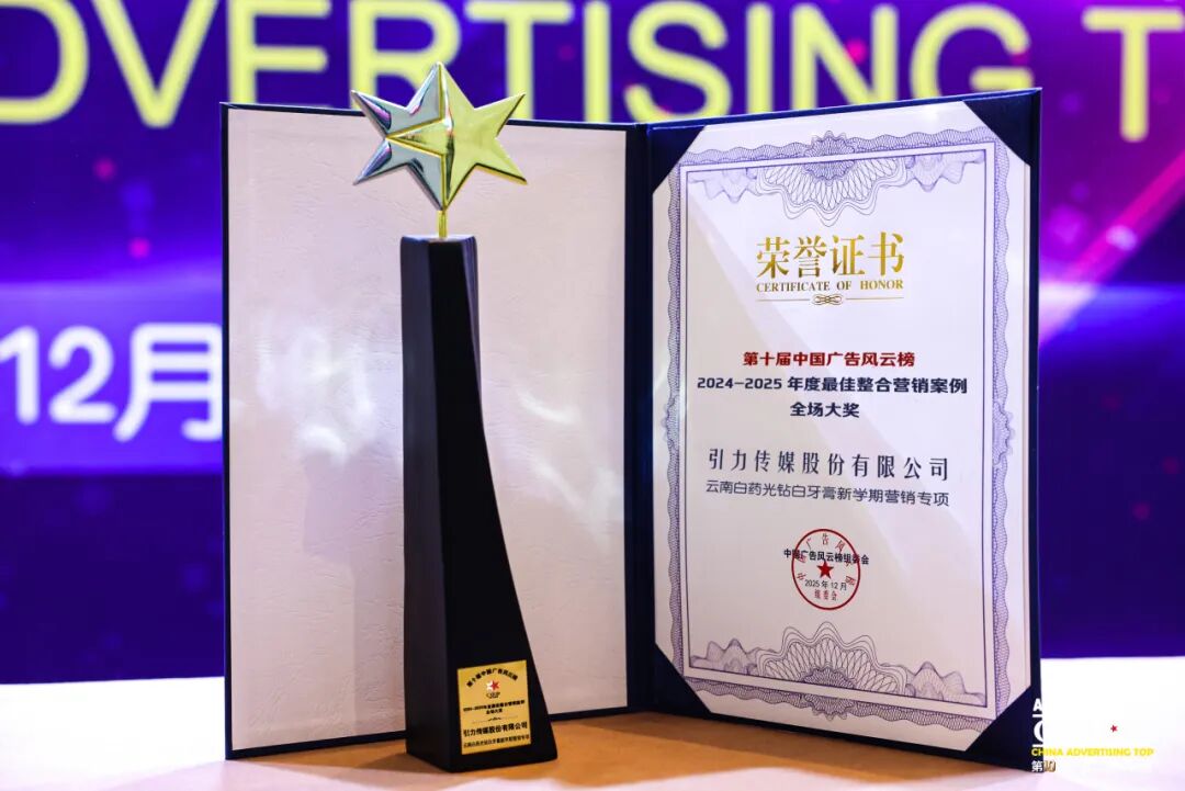 12月5日,第十届中国广告风云榜在长沙圆满落幕并公布了获奖名单。 引力传媒 携手云南白药口腔健康,报送的作品《云南白药光钻白牙膏新学期营销专项》,凭借出色的创意立意与实效突破,从逾千件参赛作品中脱颖而出,一举斩获2024—2025年度最佳整合营销案例全场大奖。