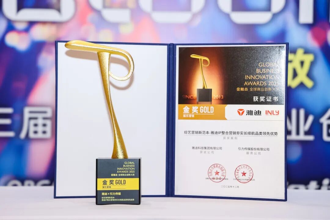 本次斩获品牌娱乐营销类金奖的,是 引力传媒 携手 雅迪 科技集团打造的《综艺营销新范本- 雅迪 IP整合营销夯实长续航品类领先优势》案例。