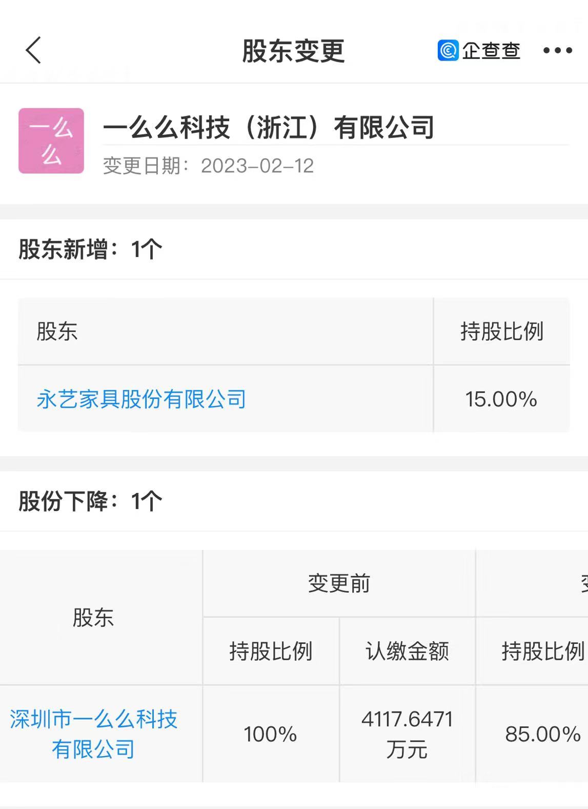 2月13日,深圳市一么么科技有限公司(以下简称“一么么科技”)转让一么么科技(浙江)有限公司(以下简称“一么么科技浙江公司”)15%股权,永艺家具股份有限公司(以下简称“永艺股份”)接盘。
