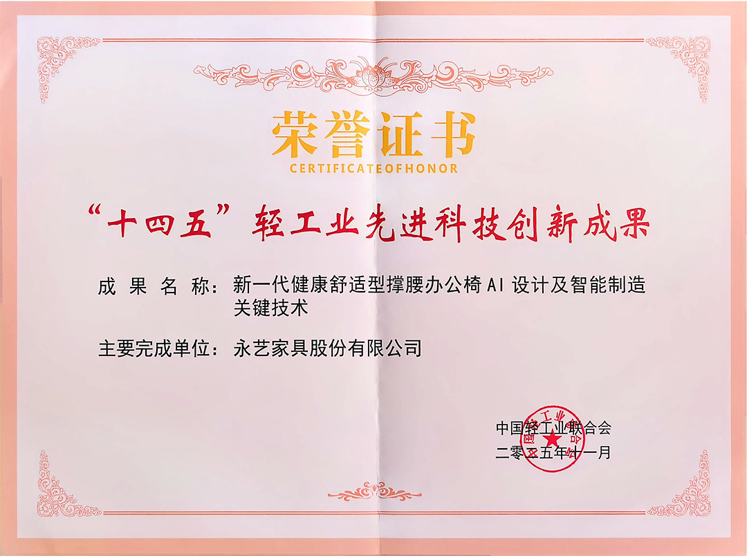 2025年是“十四五”规划的收官之年。11月11日,中国轻工业联合会在南京举办“2025轻工业科技创新与绿色发展大会”,并公布了“十四五轻工领域先进科技创新成果”。永艺股份“新一代健康舒适型撑腰办公椅AI设计及智能制造关键技术”成果成功入选,成为办公椅行业唯一获奖企业,凸显了永艺股份在座椅行业科技创新领域的引领地位。