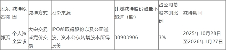 因自身资金需求,郭茂拟自减持股份计划公告披露之日起15个交易日后的3个月内,通过集中竞价及大宗交易的方式减持再升科技股份不超过30,903,906股,减持比例不超过再升科技总股本的3%。若减持期间再升科技发生送股、资本公积转增股本、增发新股、股份回购、可转债转股等股份变动事项,上述减持股份数量将相应进行调整。