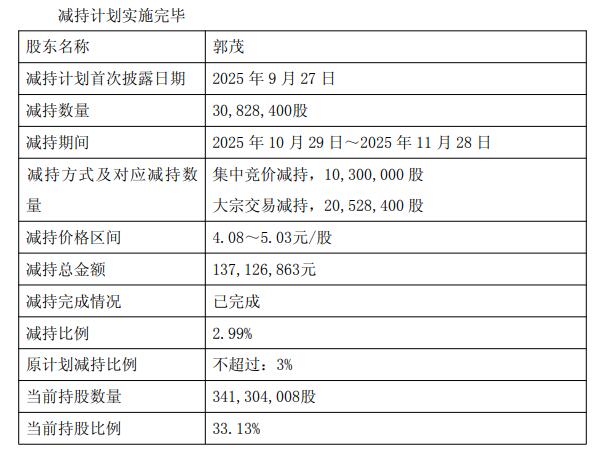 2025年10月29日至2025年11月28日,郭茂减持30,828,400股,减持价格区间4.08元/股至5.03元/股,减持总金额137,126,863元。