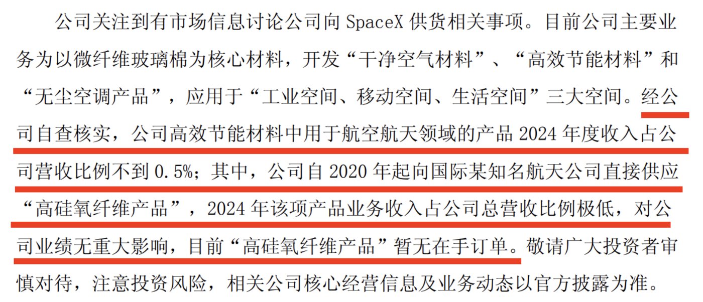 不过,在 再升科技 昨日的风险提示中,对该传闻作出澄清。经公司自查核实,高效节能材料中用于航空航天领域的产品2024年度收入占公司营收比例不到0.5%。此外,公司自2020年起向国际某知名航天公司直接供应“高硅氧纤维产品”,2024年该项产品业务收入占公司总营收比例极低,且目前“高硅氧纤维产品”暂无在手订单。
