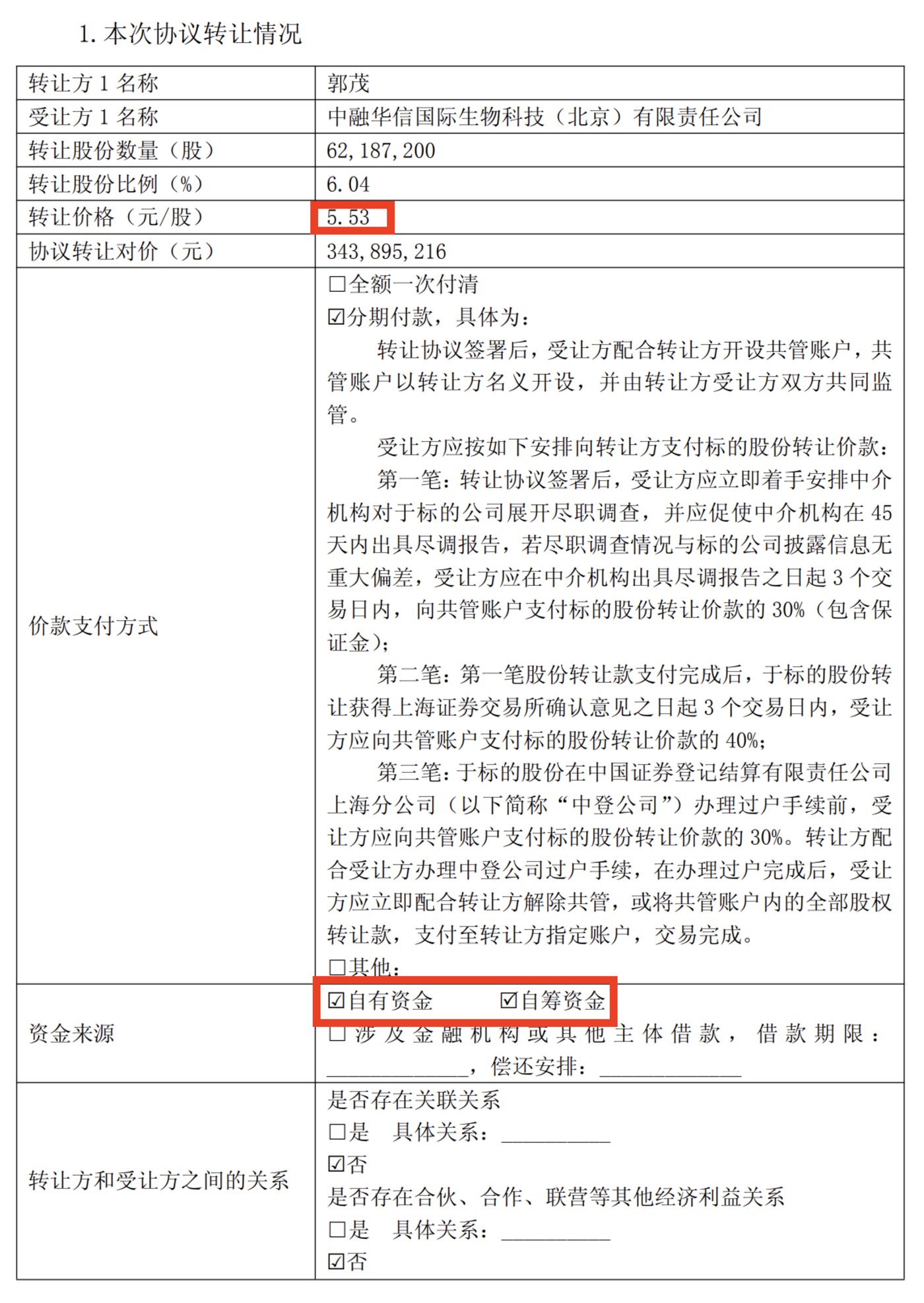 减持(10月29-11月28日)刚结束仅十天,郭茂便紧接着筹划这次协议转让:12月8日,郭茂与中融华信签订股份转让协议,中融华信拟3.43亿受让郭茂6.04%股份,并承诺过户后12个月内不减持。