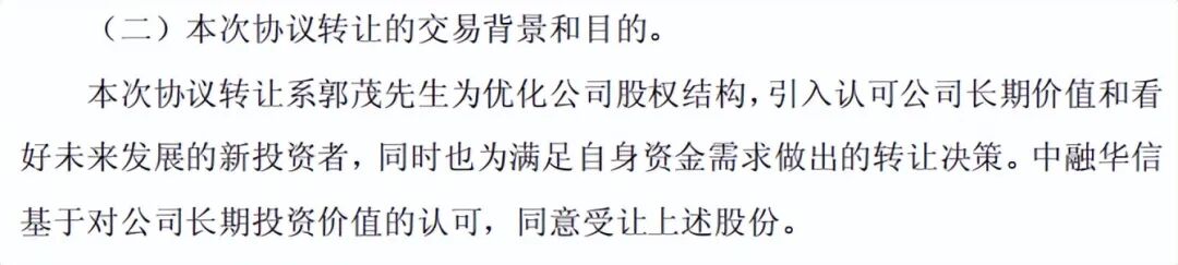 公司称此次转让的目的是引入认可公司长期价值和看好未来发展的新投资者,同时也为满足自身资金需求做出的转让决策。