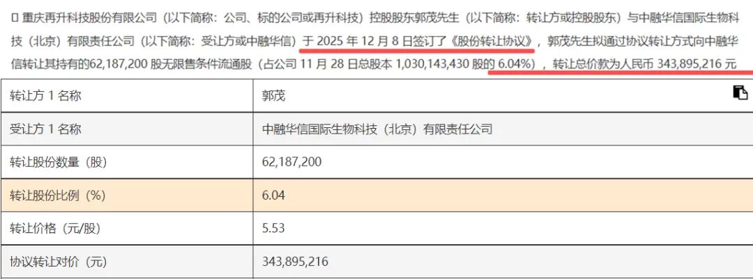 12月8日,再升科技实控人郭茂与中融华信国际生物科技(北京)有限责任公司签订《股份转让协议》,拟转让6.04%的公司股份,转让价5.53元/股,总价款3.44亿元。