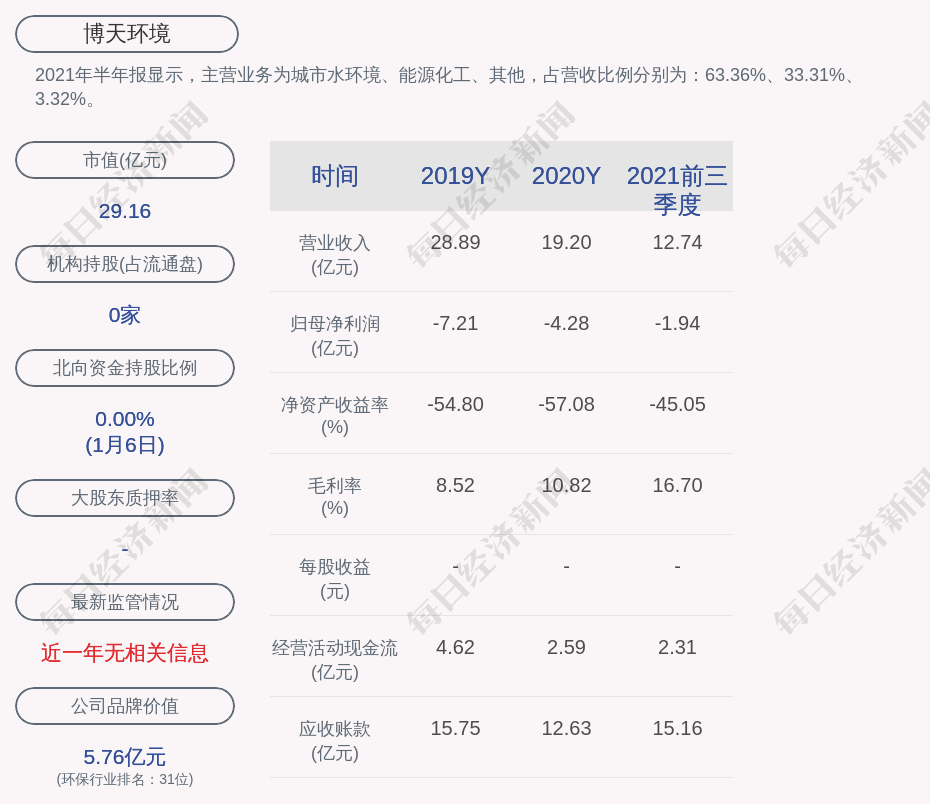 2021年半年报显示,博天环境的主营业务为城市水环境、能源化工、其他,占营收比例分别为:63.36%、33.31%、3.32%。
