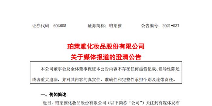 珀莱雅表示,公司就相关报道内容进行了核实,为了避免给投资者造成误导,现予以澄清说明:
