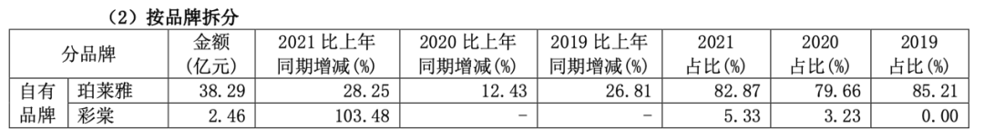 然而到了2019年,该品牌就再未被单独列出经营情况,而是划归到“其他品牌”中,取而代之的是2020年年报中备注一栏里“彩棠”子品牌当年实现1.21亿元营收的注释。