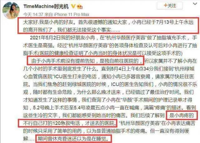 2021年7月,杭州女子小冉到杭州华颜医疗做吸脂填充手术,因全身感染造成多器官衰竭死亡。随后,杭州市卫健委认定这是一起医疗事故,华颜医疗承担全部责任。