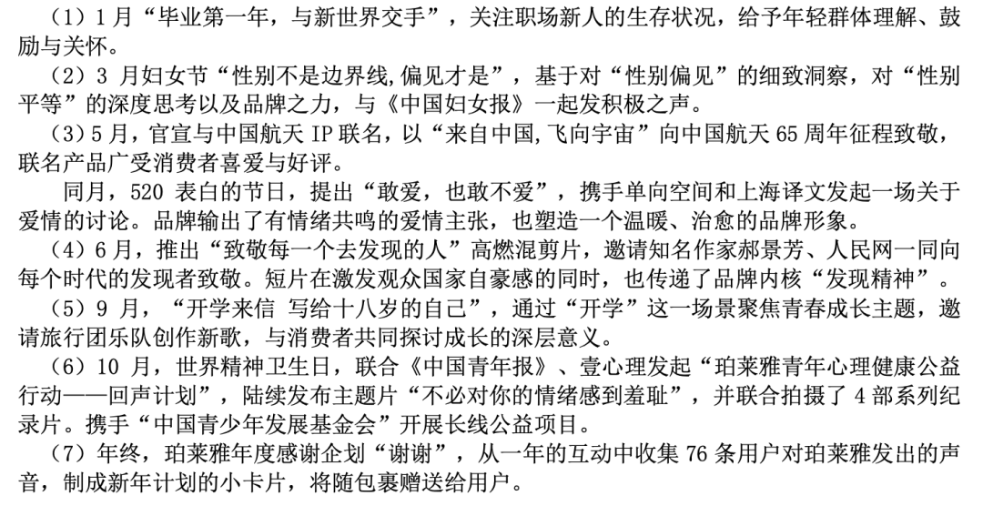 进一步梳理可以发现,珀莱雅去年的品牌营销事件可以说是五花八门。从1月聚焦职场新人、3月结合妇女节热点、5月与中国航天IP联名及“520”营销,到6月、9月、10月分别以不同主题及热点进行话题营销,再到年终活动策划,共计7件重大品牌营销事件横跨全年。