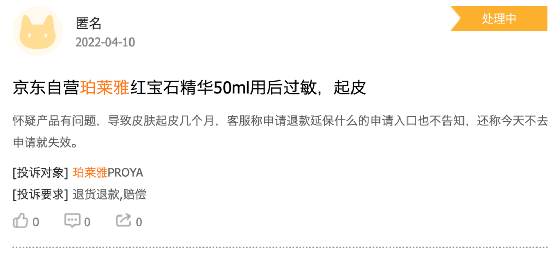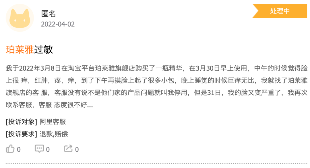 在某投诉平台上,有关珀莱雅的投诉高达千条,其中多为关“产品使用不适”“的投诉。