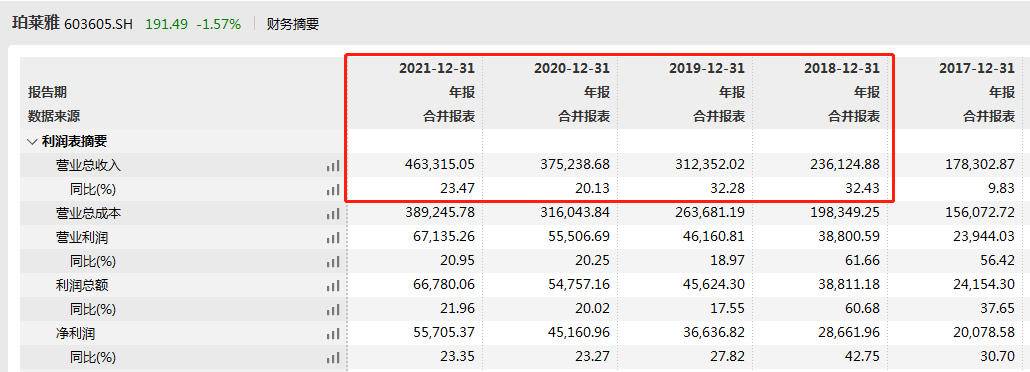 双抗精华、红宝石精华、羽感防晒等网红爆款的出现,让珀莱雅业绩蹭蹭蹭上涨,品牌也成功翻红。2018年至2021年,珀莱雅营业收入分别为24亿元、31亿元、38亿元、46亿元,连续四年同比增速保持在20%-32%。