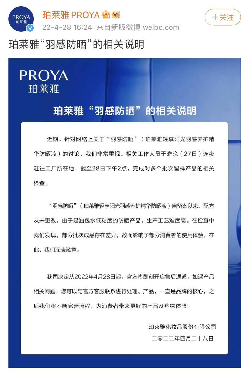 随后,珀莱雅在官方微博发布相关说明,回应称该款防晒自备案以来配方从未更改,由于是油包水低粘度的防晒产品,生产工艺难度高。另外,珀莱雅称检查中发现部分批次成品存在差异,影响了部分消费者的使用体验。扬子晚报/紫牛新闻记者咨询珀莱雅天猫官方旗舰店客服得知,已拆封使用的该款防晒也可以退货退款,运费由珀莱雅承担。记者还注意到,在珀莱雅天猫官方旗舰店,该款防晒已经下架。