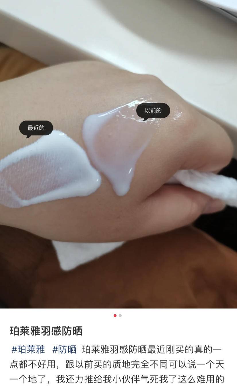 让珀莱雅最近“翻车”的,是它旗下的一款“轻享阳光羽感养护精华防晒液”(简称“羽感防晒”)。这款防晒官方售价159元,含量是50ml。有博主发布内容称,该款防晒不同批次成分有差异、防晒力不够,还有博主提出了“配方含量随意改动”等质疑。扬子晚报/紫牛新闻记者注意到,有不少消费者在社交平台反映珀莱雅“羽感防晒”不同批次品质不一样,“最近刚卖的一点都不好用,跟以前买的质地完全不同,可以说一个天一个地了。”