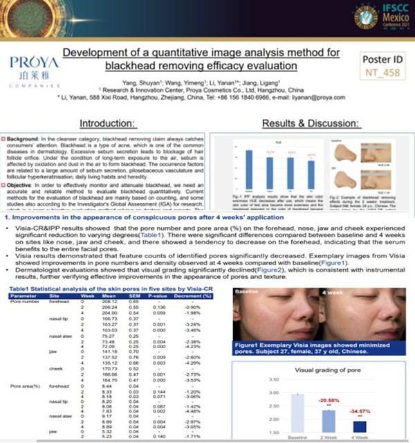 珀莱雅目前拥有国家授权发明专利104项,并积极主导或参与多项国家、行业、团体标准的建设;并在化妆品界级别最高的学术会议IFSCC上,展示了多项科研成果,比如开发了一种用于去黑头功效评价的定量图像分析方法,以及使用一款含0.8%超分子视黄醇+0.1%吡哆醇+0.1%水杨酰植物鞘氨醇+0.1%乳糖酸的精华做了一个32个人的4周随机双盲试验。证实这个成分组合使用4周可以显著减小脸颊、鼻子、下巴处的毛孔数目和面积。