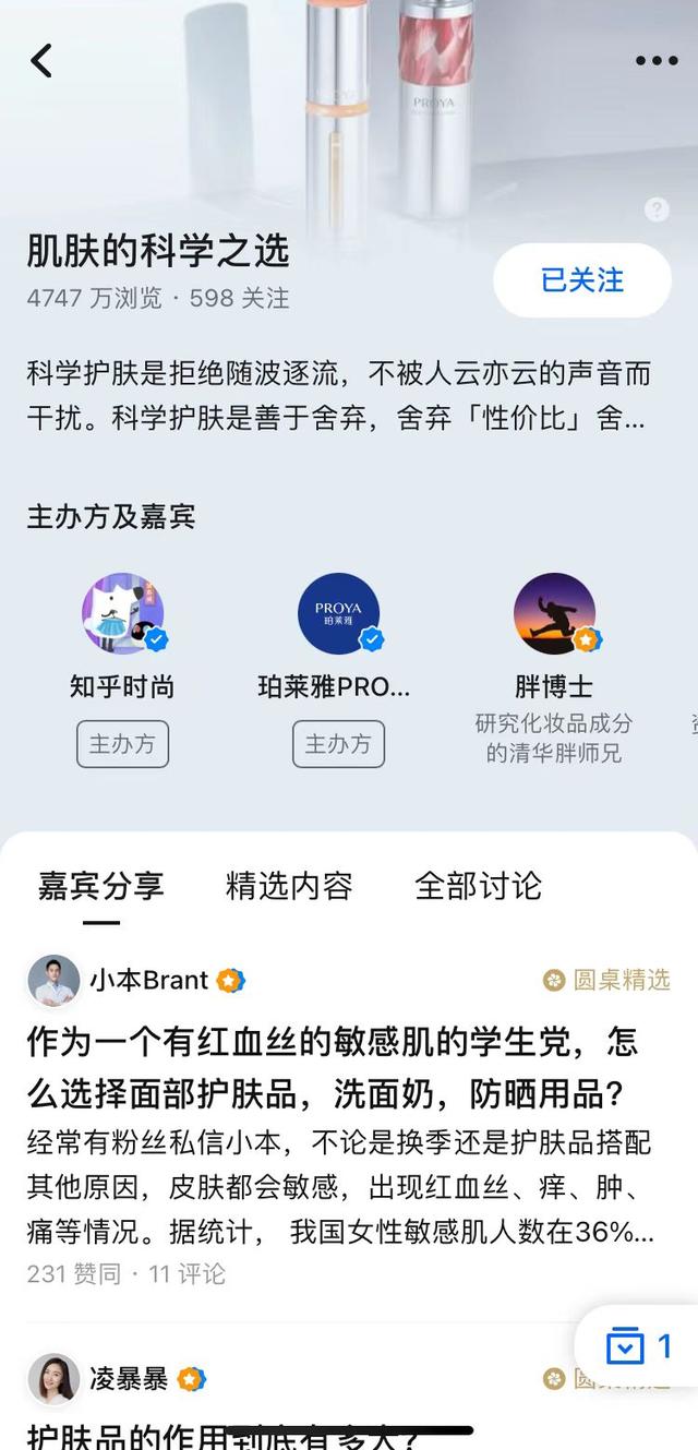 为回应消费者的呼声,8月10日-8月19日,珀莱雅联合知乎,邀请各大知名成分党KOL坐镇,在知乎站内开展线上圆桌话题讨论「肌肤的科学之选」,探讨珀莱雅科学护肤理念的同时,也针对消费者遇见的各式护肤疑难展开解答,以这种“授人以渔”的互动方式,助力消费者建立更加全面的科学护肤体系。