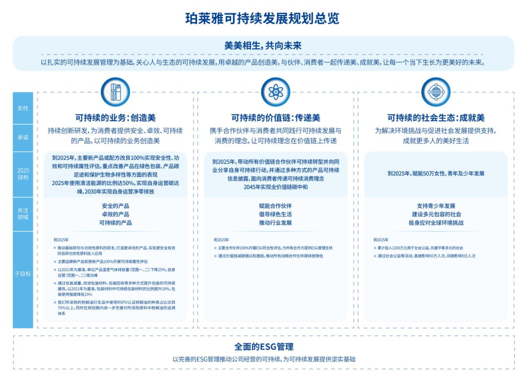 著名社会学家费孝通老先生有一句充满中国智慧的箴言:“各美其美,美人之美,美美与共,天下大同”,珀莱雅的可持续发展规划与此遥相呼应。