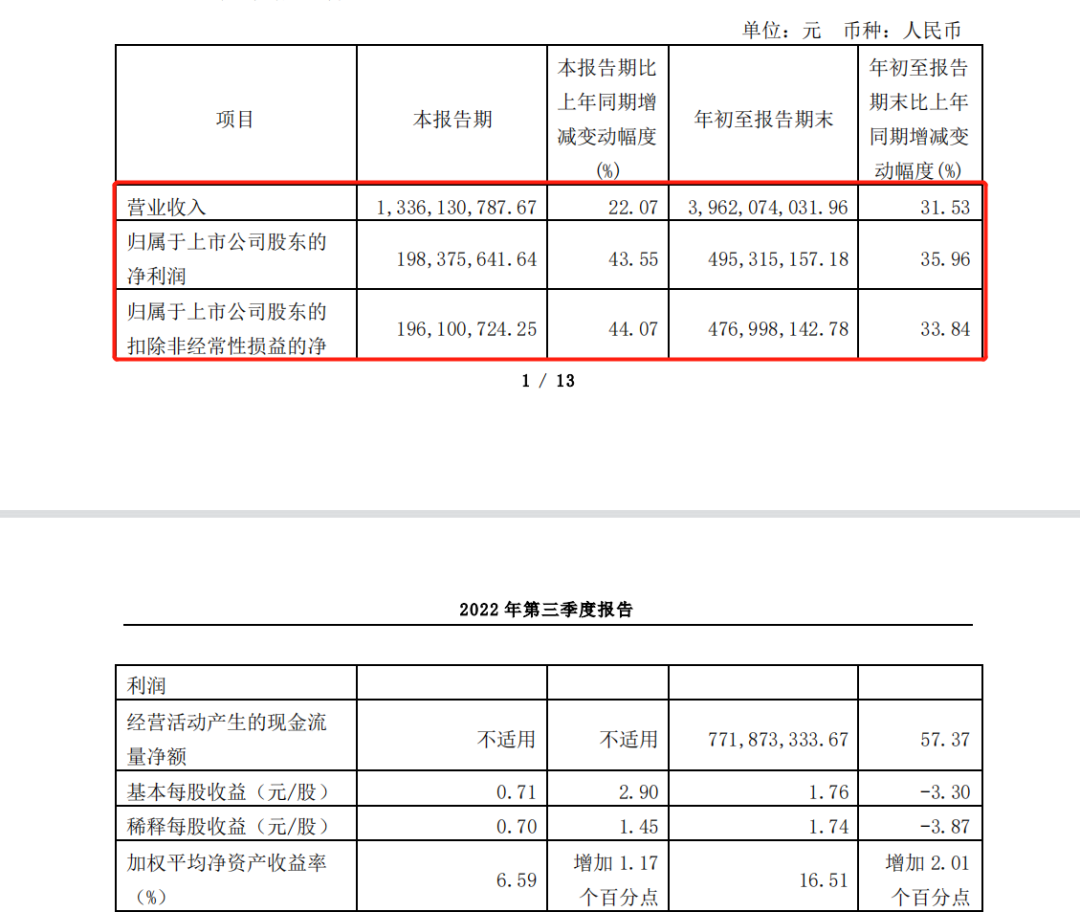 报告期内,珀莱雅实现营业收入13.36亿元,同比增长22.07%;归属于上市公司股东的净利润1.98亿元,同比增长43.55%;归属于上市公司股东的扣非净利润1.96亿元,同比增长44.07%。
