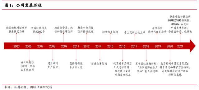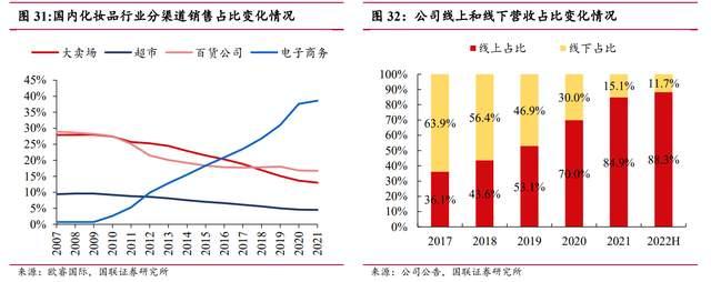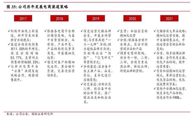 从线下CS渠道切入奠定基础,把握线上电商红利助力快速发展,前瞻布局社交电商平台抢占先发优势。公司产品最初从日化专营、百货商超等CS渠道切入,抓住早期CS渠道红利,做大品牌规模,奠定坚实基础。
