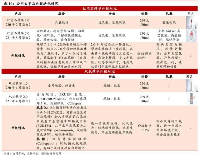 1)2020年2月,公司推出第一代红宝石精华,其成分主打20%的六胜肽和1%的独家超分子维A醇。2021年5月,公司推出红宝石精华2.0版本,将1.0版本中的六胜肽-8升级为六胜肽-1,并进行产品成分简化,在增强抗衰老功效的同时优化肤感体验,并采用全新Airfree真空包装使产品品质得以更好地维持。