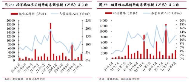 2021年公司代表大单品双抗精华、红宝石精华、源力修护精华等占公司销售收入超过25%,在天猫渠道销售占比高达约60%;其中双抗精华和红宝石精华自迭代后在天猫平台销售额占比分别从5.50%/4.46%提升至24.60%/17.46%。