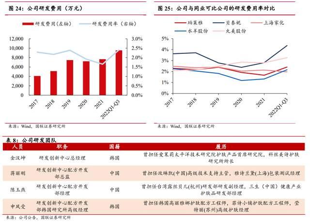 截至2021年末,公司研发团队人数达158人,研发人员数量占比达5.6%,专业背景系统涵盖皮肤科学、生物化学、材料科学、医学、工业造型设计等多个方面,其中研发团队高管大多拥有国际知名化妆品公司或代工厂的产品研发经历和丰富的管理经验。