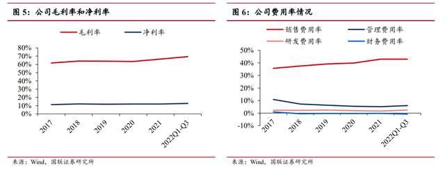 受益于公司成功践行大单品策略以及线上渠道收入占比持续提升,公司整体毛利率由2017年的61.73%增长至2021年的66.46%,2022 年前三季度公司毛利率同比+4.84pct 至 69.43%。
