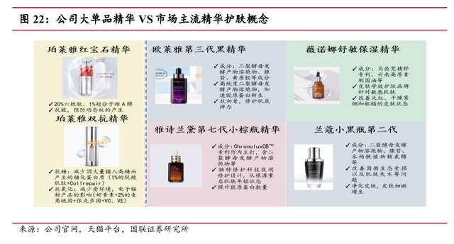 大单品主打抗初老/抗糖抗氧形成差异化竞争,同时锁定相对空白的大众精华市场。