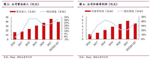 2017-2021年,公司营收由17.83亿元增长至46.33亿元,CAGR达27.0%;归母净利润由2.01亿元增长至5.76亿元,CAGR达30.1%。2022年前三季度,公司实现营收39.62亿元,同比增长31.5%;实现归母净利润4.95亿元,同比增长36.0%。