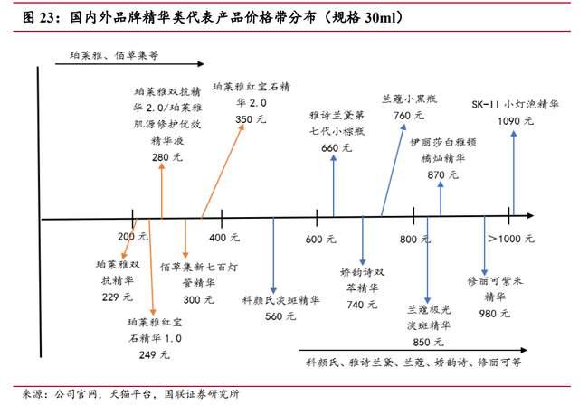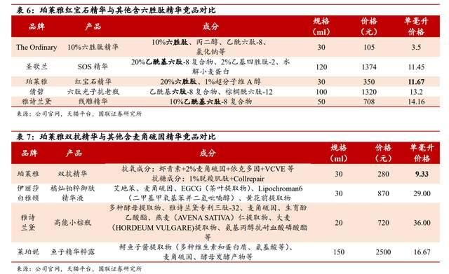 2)不同于目前市场主流的高客单价的外资品牌精华,公司精华大单品历经产品升级迭代仍维持200-400元左右的大众价格带,定位于目前国内较为空白的大众精华市场,具有明显的性价比优势,例如红宝石精华包含高达20%的六胜肽,核心成分含量明显高于除西班牙品牌圣歌兰旗下的SOS精华外的其他含六胜肽成分精华的产品,而对比含相同成分的海外大牌,珀莱雅具备明显的价格优势。