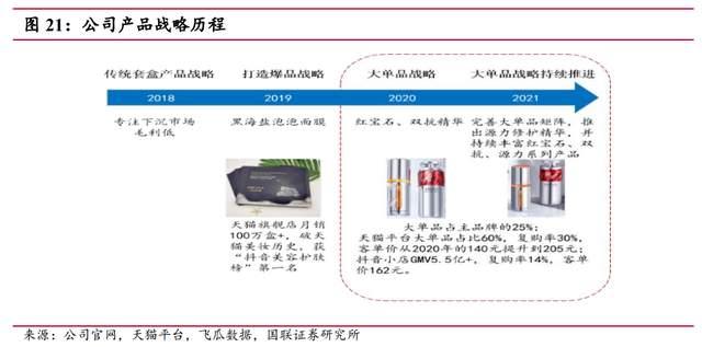 3)大单品策略(2020年至今):2020年,公司大单品策略启动,成功推出红宝石精华、双抗精华、源力修护精华等多款功效突出、差异化特征明显、研发壁垒深厚的大单品,提升产品客单价和复购率,标志着公司产品的发展逻辑从“量增”向“质升”转变,助力品牌穿越时间周期、全面提升品牌形象。根据魔镜数据,2021年大单品销售额占主品牌珀莱雅销售额已超过25%。