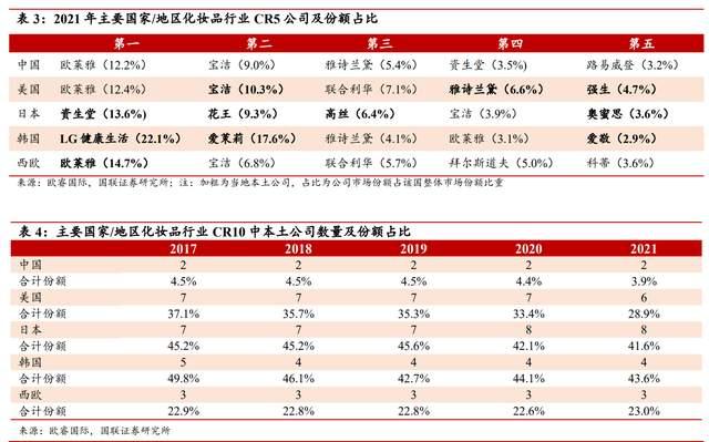 近年来国内化妆品市场集中度持续提升,截至2021年,国内化妆品市场 CR10为43.7%,但相比海外成熟化妆品市场如韩国(58.6%)、美国(56.8%)和日本(48.3%)等仍较低。