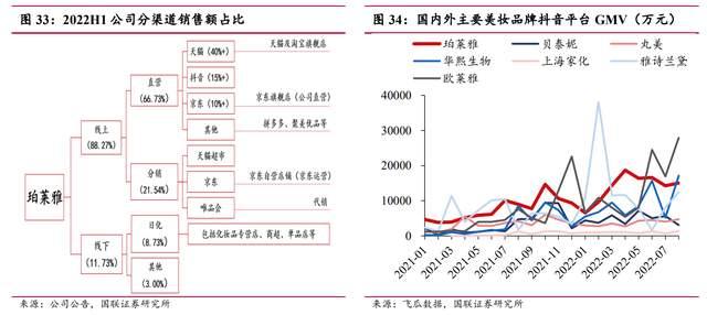 2020年以来面对社交电商崛起机遇,公司再度拥抱抖音等直播电商机会,于2020年9月正式入驻抖音,采用“自播为主,达人合作为辅”的运营模式,实现品牌宣传和消费转化双丰收。2022年1-8月,公司在抖音平台销售额达11.2亿元,同比增长129.1%,位于国货品牌销售前列,与海外品牌相比也具有提前布局优势。
