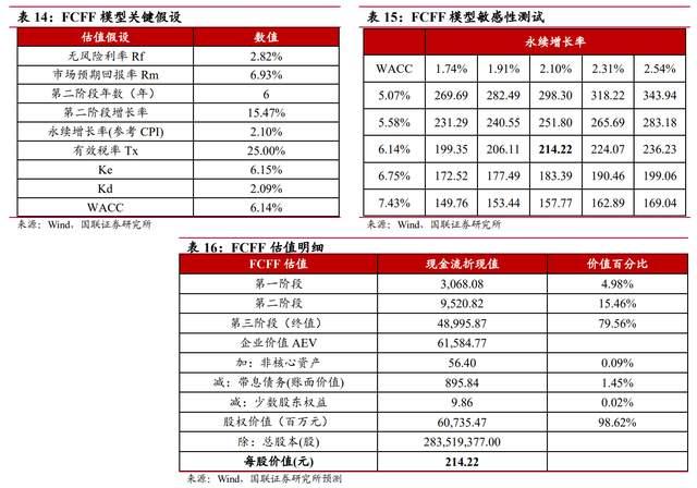 3)2030年以后为第三阶段,公司各项业务逐渐进入成熟期,公司将保持稳中有升的增长趋势,此时现金流充足,业务稳定,参考国内CPI指数情况给予永续增长率2.1%计算。最终FCFF估值测算得公司股票价值为214.22元/股。