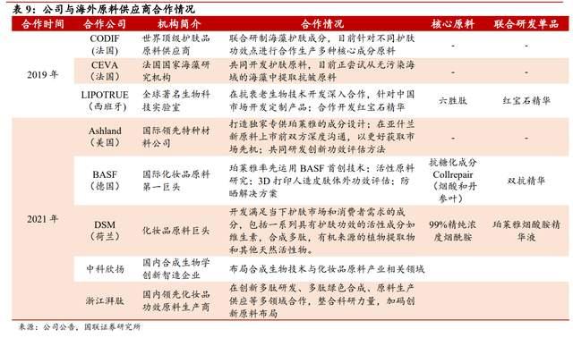 公司在原有研发创新中心的基础上,成立了国际科学研究院,围绕细胞、皮肤和原料开发加强基础研究。此外,公司先后与CODIF&CEVA、Lipotrue、亚什兰、巴斯夫、帝斯曼、中科欣扬、浙江湃肽等国内外原料商和实验室进行战略合作,持续增强公司基础研发实力和供应链稳定性。