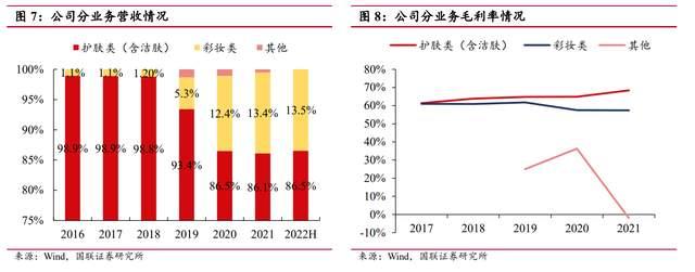 公司产品品类主要包括护肤品和彩妆两大类,其中护肤品业务为公司主要的营收来源,2017-2022H1年营收占比均维持在85%以上,产品主要包括霜、护肤水、乳液、精华等。此外,公司彩妆类业务增长势头强劲,2019-2021年营收占比由5.3%提升至13.4%,产品主要包括妆前乳、粉底液、修容盘等。