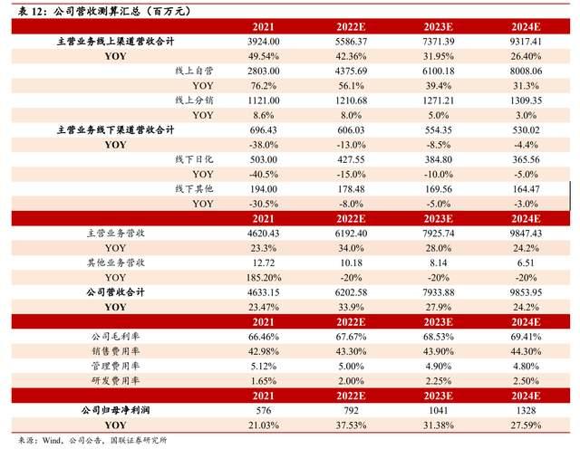 综合看,我们预计公司2022-2024年线上自营渠道同比增速分别为56.1%/39.4%/31.3%。