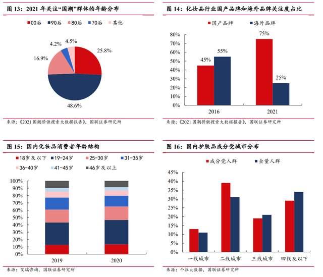 此外,化妆品消费人群主要为受过高等教育的95后年轻群体,同时也是移动互联网的重度用户,对信息的获取能力强,“成分党”逐渐兴起,品牌不再是其产品选择的唯一标准,在消费理念上更加强调安全性和功效性,未来随着新消费人群逐渐成为消费主力军以及国货竞争力不断增强,国货品牌份额有望持续提升。