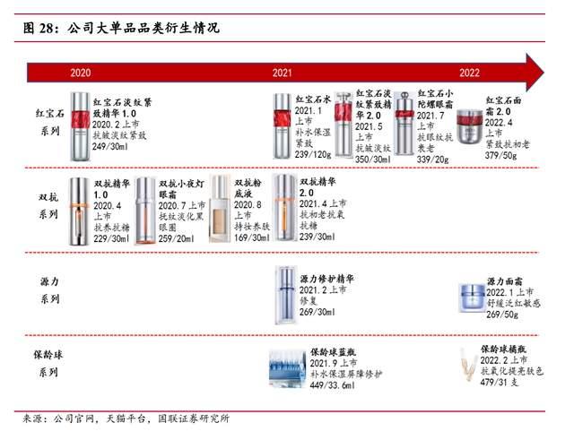公司成功打造大单品后,逐步推出包括粉底液、面霜、眼霜等在内的红宝石系列、双抗系列、源力系列、保龄球系列等,满足消费者多元化护肤场景需求。