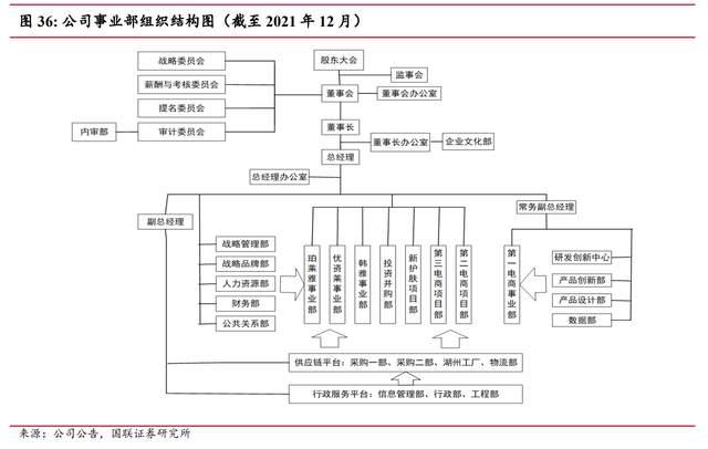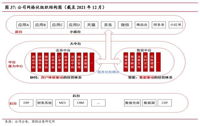 2021年12月,公司开始正式为其信息化系统升级建设项目募集资金,建设数字化中台赋能前台业务,使得其组织结构先进性与成熟外资品牌同步。目前公司已形成了包括战略品牌部、研发创新中心、产品创新部、产品设计部、数据部等多个中台部门,可高效串联与服务各品牌产品开发与推广,提升大单品开发的精准性、高效性和可复制性,并助力新品牌孵化和拓展。