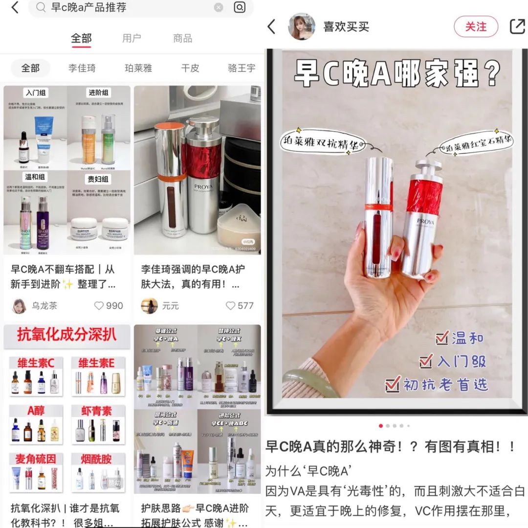 2020年,珀莱雅捆绑“早C晚A”概念,推出王牌单品红宝石精华和双抗精华。随后,一股“早C晚A”的风吹过护肤界,不仅各大美妆博主必推,首选产品还都是珀莱雅家的。在小红书平台输入“早C晚A”,前4条推文中,至少1条是关于珀莱雅的。